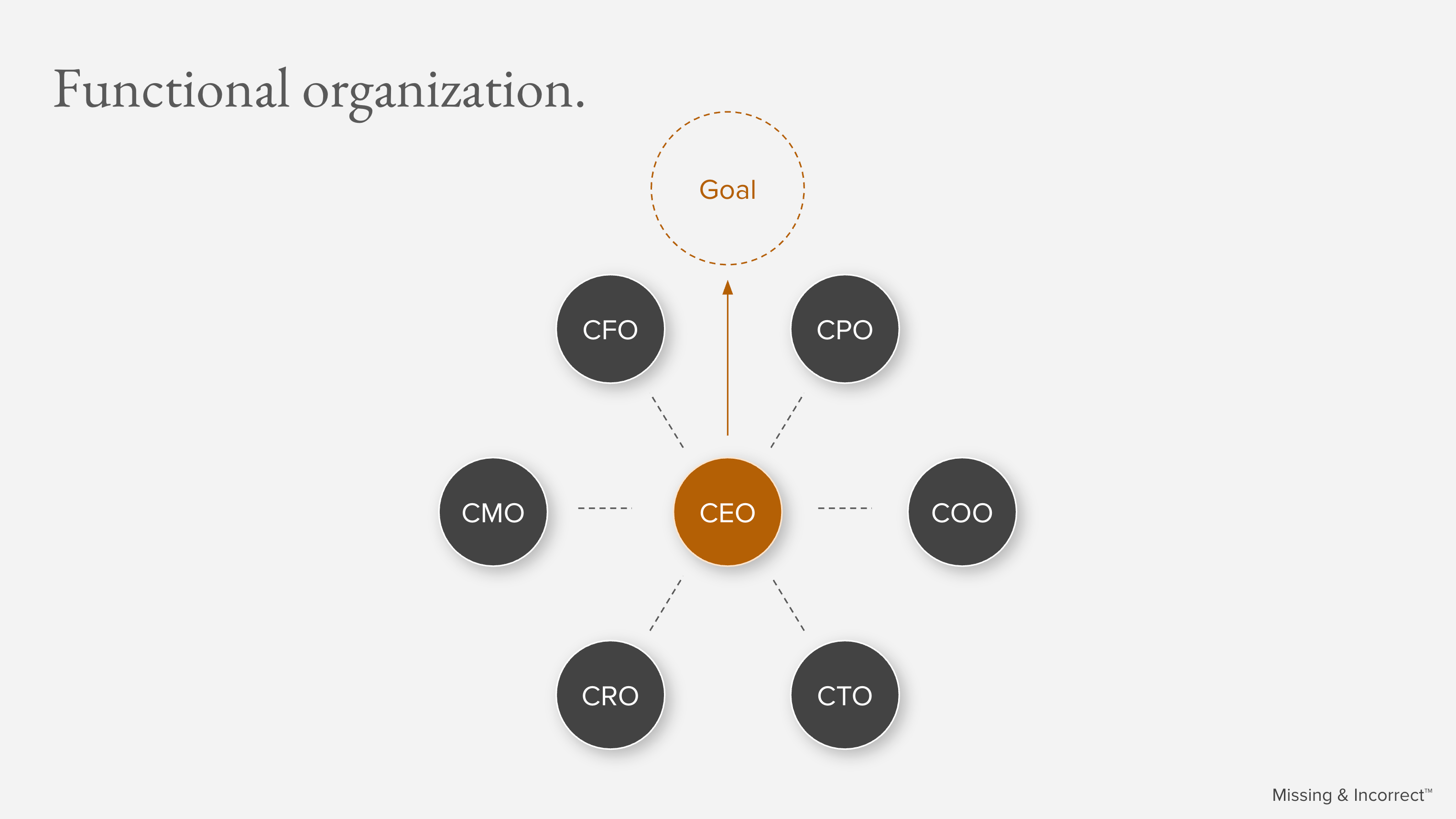 Most Chief Whatever Officers don’t get to the upper rung of management by being meek, deferential, pushovers. So, it’s perhaps not surprising that, left to their own devices, each imagines that they are completely autonomous actors, empowered to make independent decisions for the betterment of the company. This structure - often known ironically as a ‘functional’ organization - requires an incredibly involved CEO at its center, running the planning and execution motion that keeps each of these executives aligned, collaborating, and generally rowing in the same direction.
